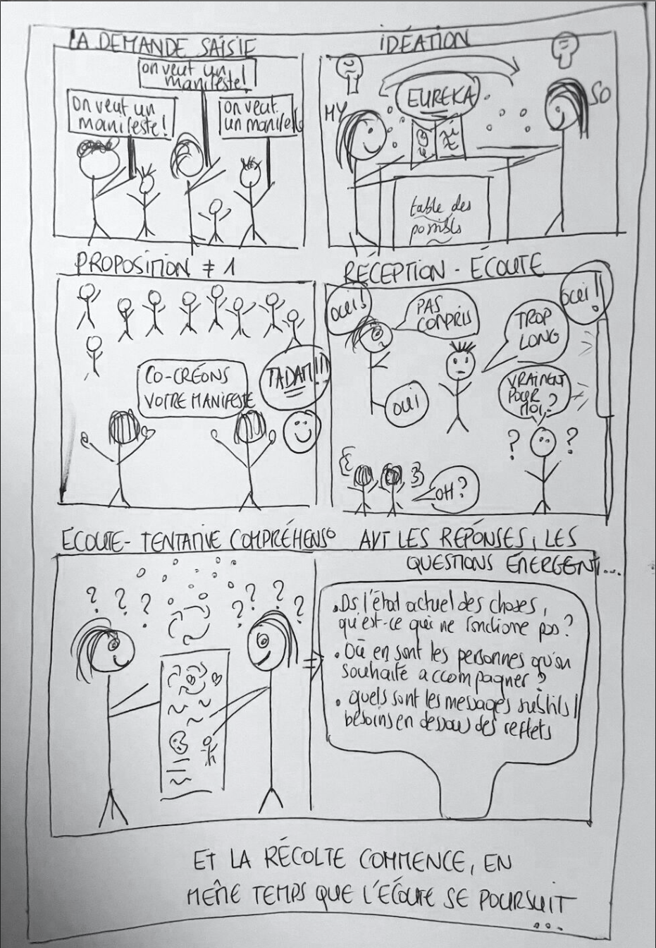 Lorsque les équipes sont plus larges, nous suggérons souvent de former à l’interne un comité de pilotage composé de personnes aux rôles, perspectives et sensibilités variées. Ce comité peut porter la réflexion durant la journée, puis nourrir et faire circuler les apprentissages au sein du reste de l’équipe par la suite.